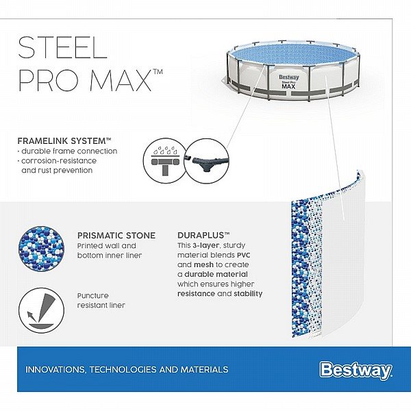 יריעת הבריכה מיוצרת בטכנולוגיית Tritech(tm) – יריעת PVC בעלת 3 שכבות, כאשר השיכבה האמצעית המצויה בלב ה-PVC הינה שכבת רשת מחוזקת המבטיחה חוזק מיוחד ועמידות גבוהה. היריעה מיועדת לעמוד בחשיפה ממושכת לקרני UV ולחשיפה לכלור. היריעה נבחנה לעמידות במשקל ולחץ גבוהים הנובעים מתכולת מים גבוהה.