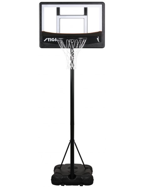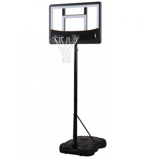 מתקן כדורסל נייד עם לוח שקוף למשחק כדורסל בחצר הבית.