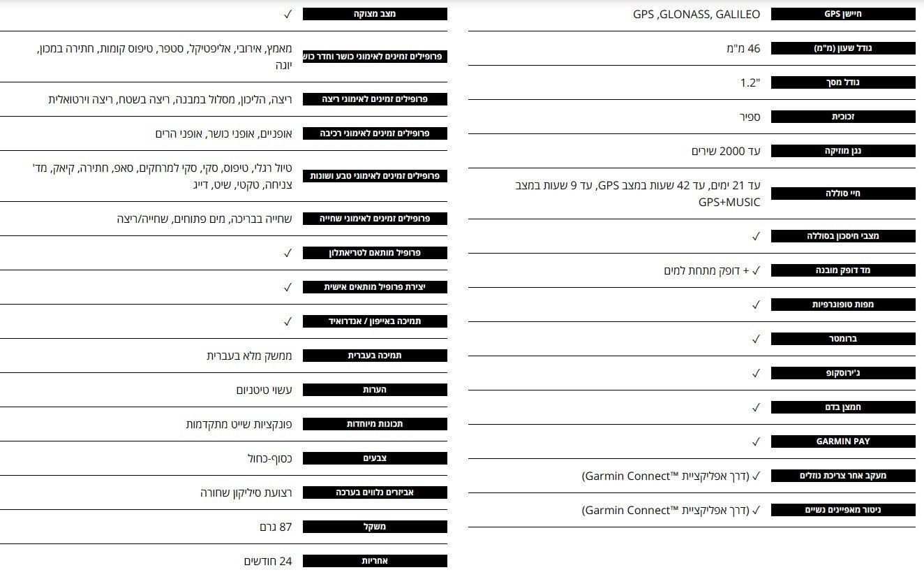 ציון עקה (סטרס) עקבו אחרי דופק הלב שלכם ישירות מרפק כף היד, כמו גם גמישות הדופק ושינויים, לחישוב ציון העקה (סטרס) שלכם. חיישן Pulse Ox הציצו בנתוני Pulse Ox2 כדי לרכוש מודעות לרמות החמצן בגוף שלכם, ועד כמה הן מסתגלות לאוויר דל יותר בגבהים. אפליקציות ופעילויות אפליקציות מועדפות ופרופילי פעילות מוטענים מראש עבור גולף, שחיה, ריצה, רכיבה על אופניים, צעידה, חתירה, סקי ועוד.