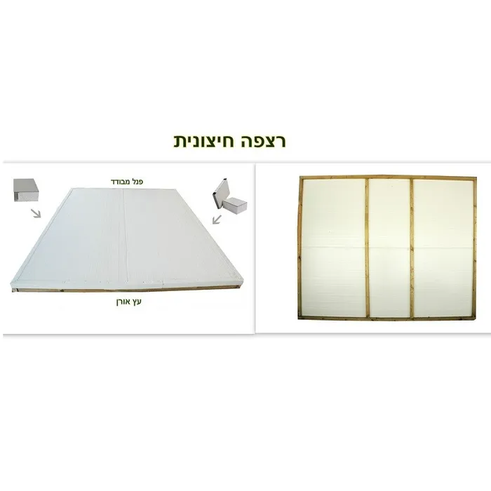 2. רצפה חיצונית - משמשת כתחליף קרקע יציקה, נתין להניח על אדמה, דשא וכו', רצפת מתכת (מסגרת עץ עמיד למים + פנל מבודד) נותן אטימה של 100% נגד מים. מחיר הרצפה למחסן: 1090 ש"ח
