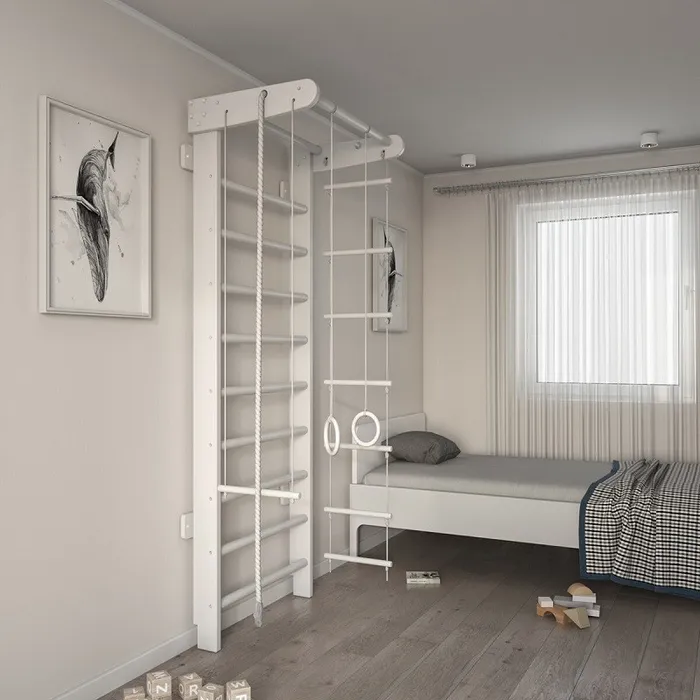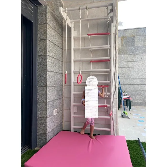 סולם שוודי זה מתאים לכל המשפחה: הורים יכולים להשתמש במוט האופקי העליון עם שתי קורות הרוחב,