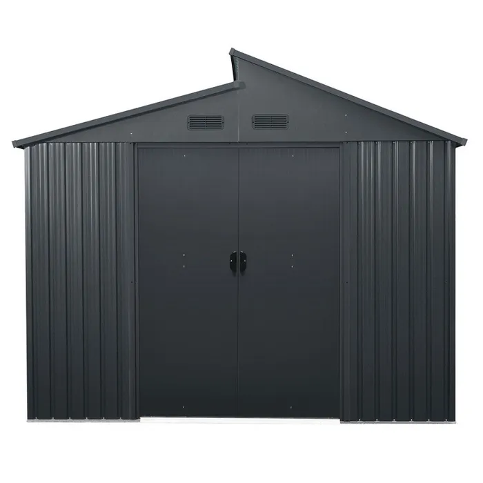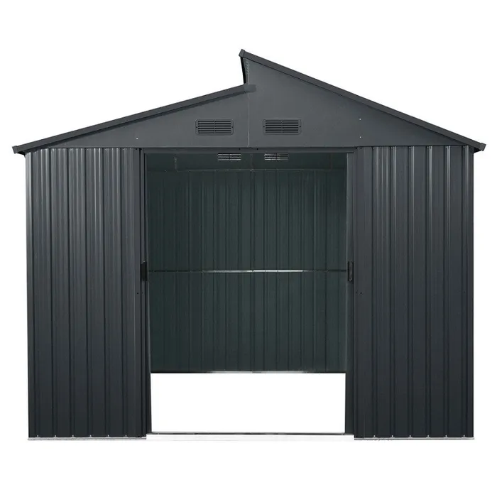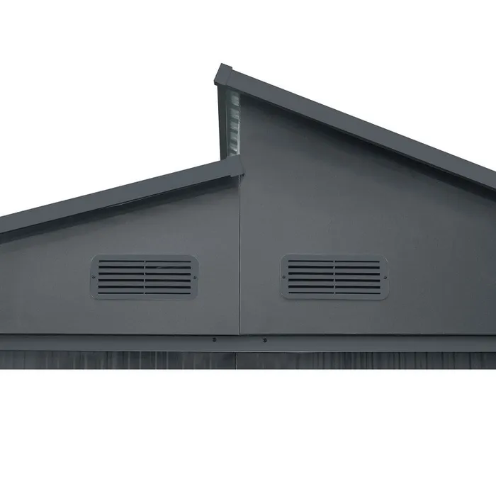 למחסני המתכת מבית Garden Top זוג דלתות הזזה על מסילה פנימית ו-4 פתחי אוורור ובעלי חלון ייחודי.