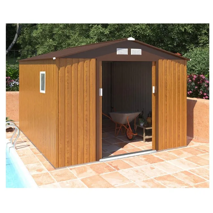 מחסן דקורטיבי בצבע דמוי עץ צבוע בתנור עם אחריות לחלודה ולשמירת הצבע