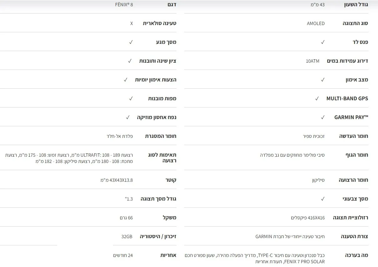 שעון חכם בקוטר 43 מ"מ 242911 FENIX 8 AMOLED SAPPHIRE מבית GARMIN