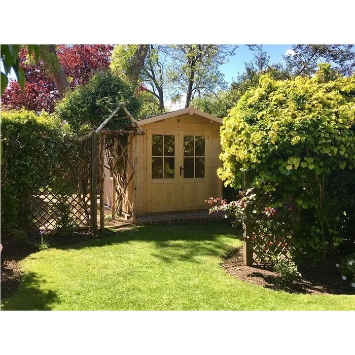 מחסן עץ מעוצב לגינה, עובי קורות עץ 28 מ"מ ( עבה במיוחד!), המחסן כולל רצפה ותוספת גגון.