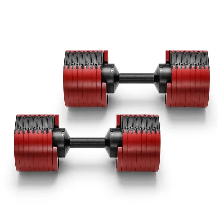 זוג משקולות יד מתכווננות איכותיות מאוד במשקל מ-2 ועד 32 ק”ג, כולל שני תושבות להנחת המשקולות.