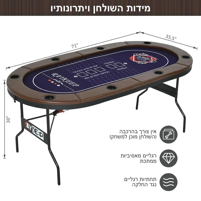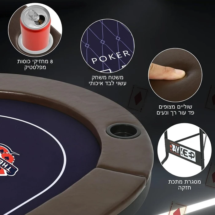 שולחן פוקר המתאים ל-8 שחקנים הכולל 8 מחזיקי כוסות מינרוסטה, ציפוי עור סינטטי מרופד בדפנות השולחן.