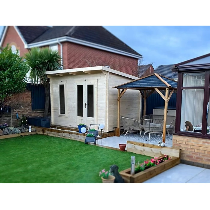 מחסן עץ מעוצב לגינה, עובי קורות עץ 45 מ"מ (עבה במיוחד!), המחסן כולל רצפה ותוספת גגון.