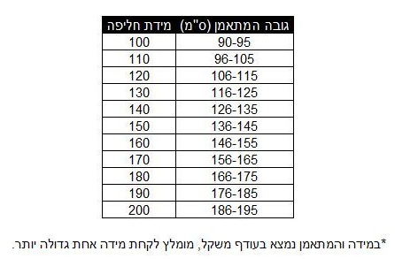 מידות לבחירה: 110, 120, 130, 140, 150, 160, 170, 180 ס"מ