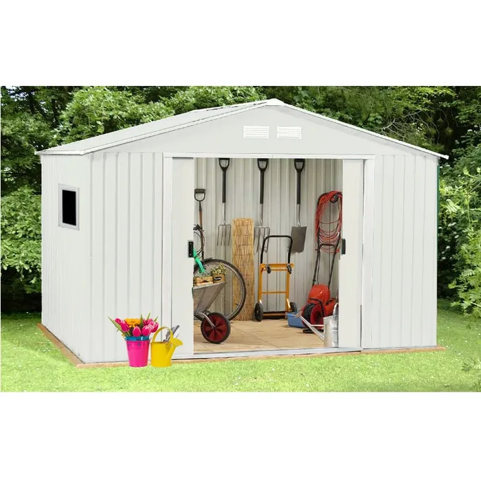 - למחסני המתכת מבית Garden Top זוג דלתות הזזה על מסילה פנימית ו-4 פתחי אוורור ובעלי חלון ייחודי.