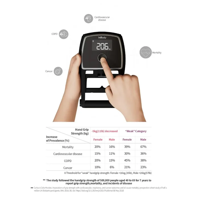 ביומרקר משמעותי לחיזוי בריאותי: חוזק השרירים הוא גורם יסודי המשפיע ישירות על היכולות הפיזיות ומשמש אינדיקטור לחיזוי בריאות כללית. כוח האחיזה, בפרט, מתואם באופן חזק עם כוח הגוף הכללי. קורלציה זו הופכת את הערכת כוח האחיזה לחלופה פרקטית ונוחה למדידת כוח שרירים כולל, והיא שיטה חסכונית וקלה לביצוע. ה-InGrip מבטיח דיוק ועקביות לטובת חיזוי תחלואה, תמותה והערכת כוח השרירים.