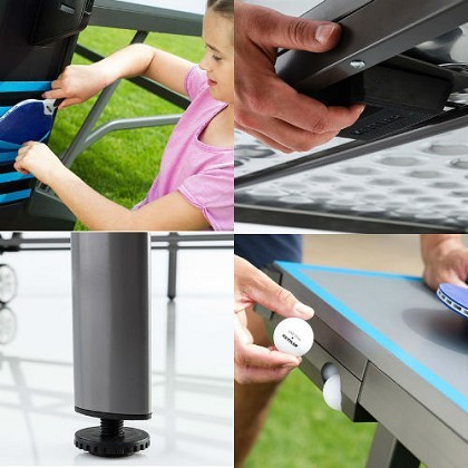 כיסויי פינות להגנת הפלטות. מתקן לאחסון מחבטים וקופסאות אחסון כדורים בשני צידי השולחן. מערכת נעילה פשוטה לשימוש ביד אחת לסגירת השולחן.