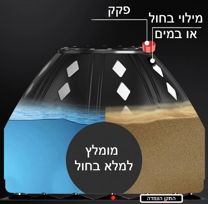 משקל לאחר מילוי מים כ-100 ק"ג ולאחר מילוי חול כ-150 ק"ג.