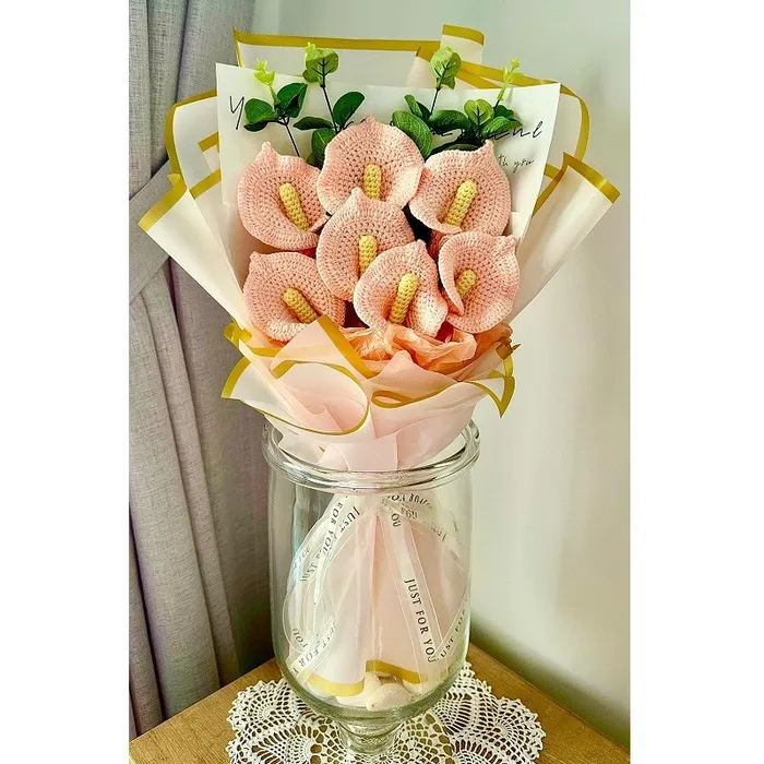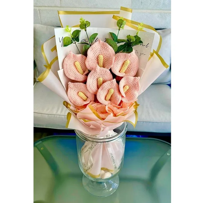 7 פרחים סרוגים, 4 ענפים של אקליפטוס מלאכותי, נייר עטיפה קוריאני, חוטי מתכת, אורות לד צבעוניות מתחלפות.