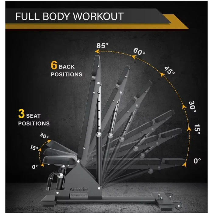 זוויות מתכווננות של המשענת (0°, 15°, 30°, 45°, 60°, 85°) והמושב (0°, 15°, 30°) מאפשרות ביצוע מגוון רחב של תרגילים.